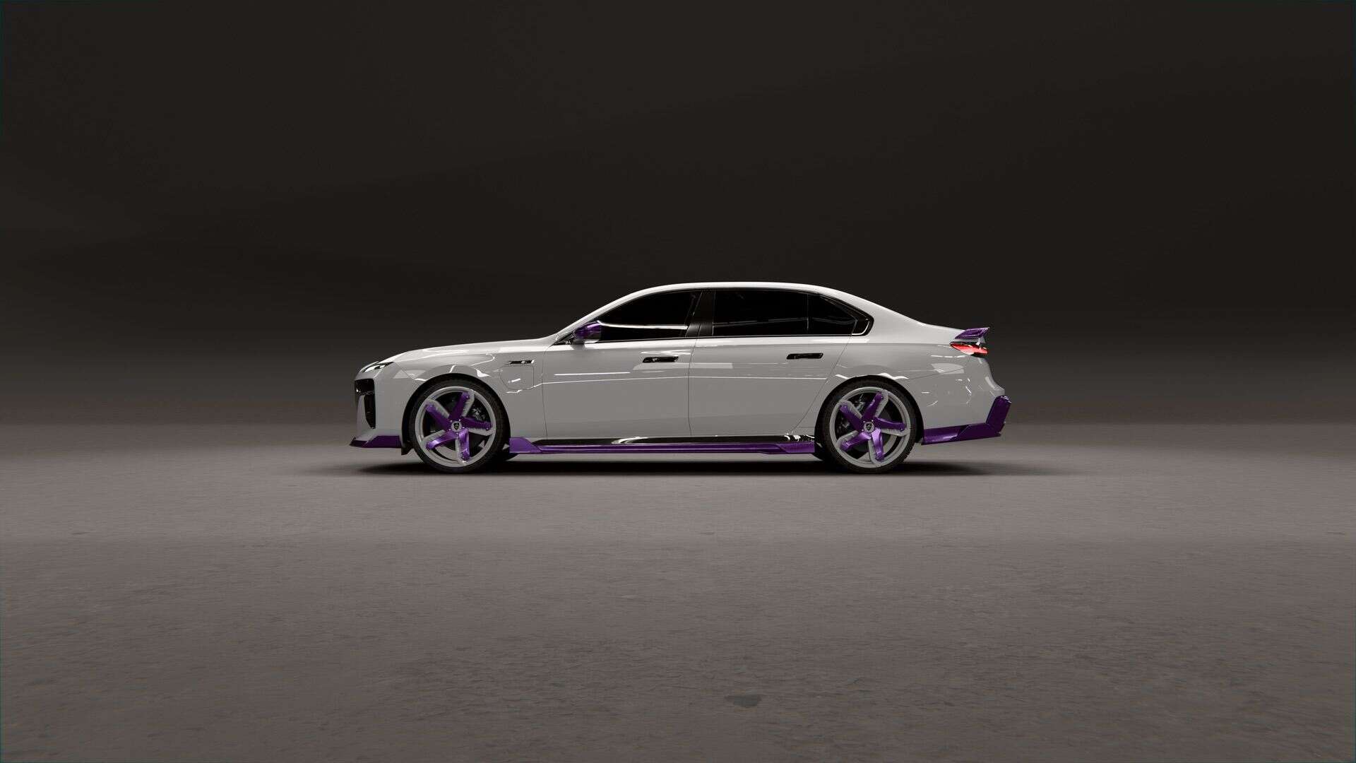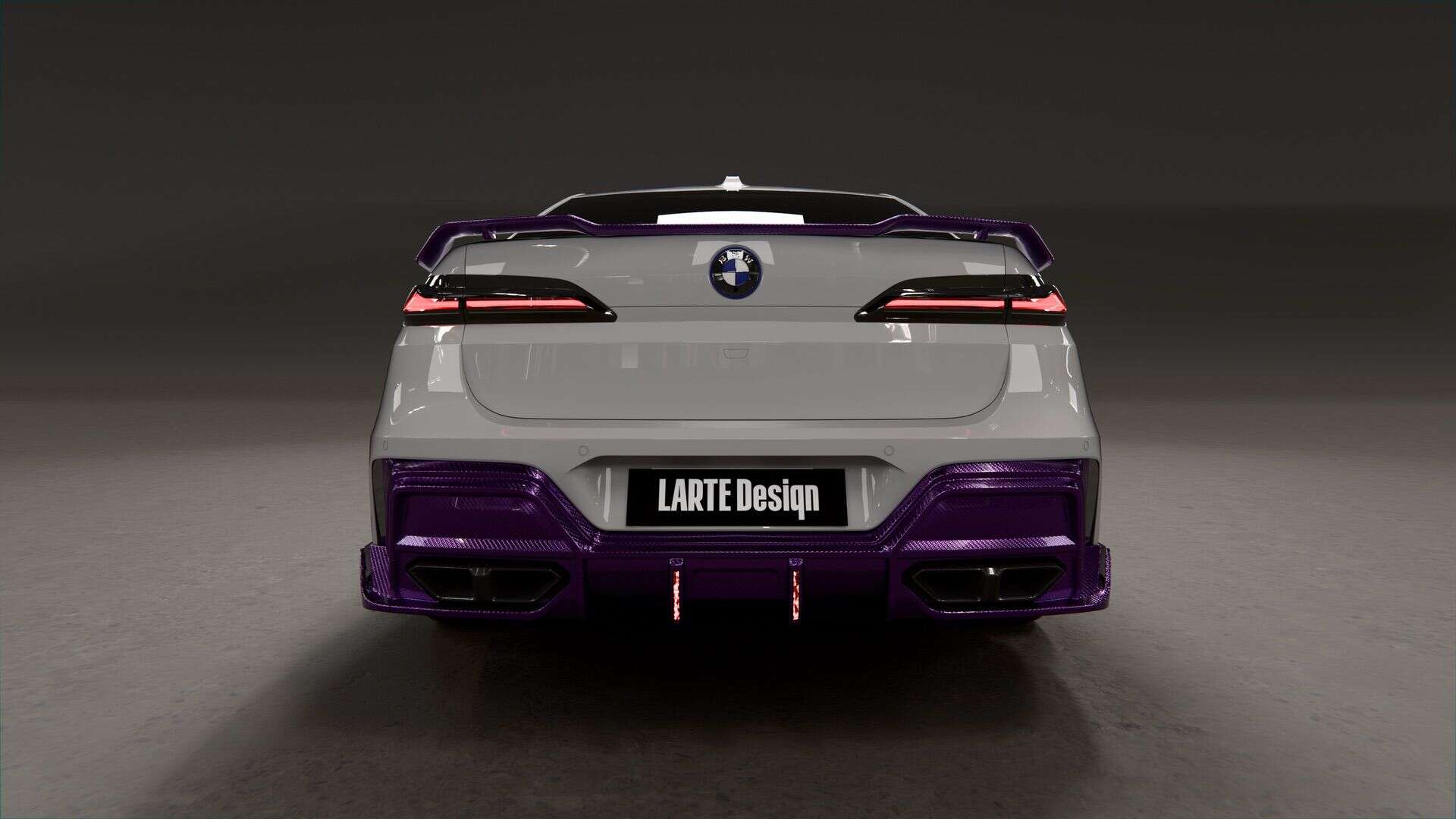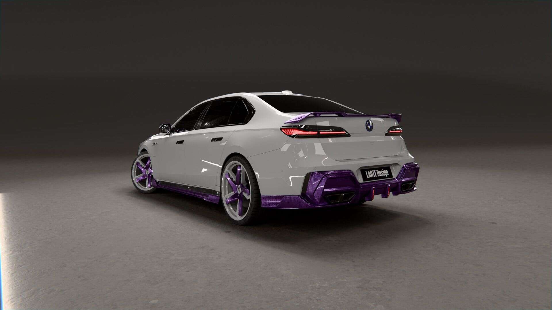 The design logic behind the color pairing is deliberate too. White defines the 7 Series’ architectural volume; the violet carbon is meant to draw attention to specific geometry — the hood line, skirt profile, diffuser plane — rather than making the car louder as a whole. The result, as LARTE puts it, is a car that reads as more precise, not more aggressive.